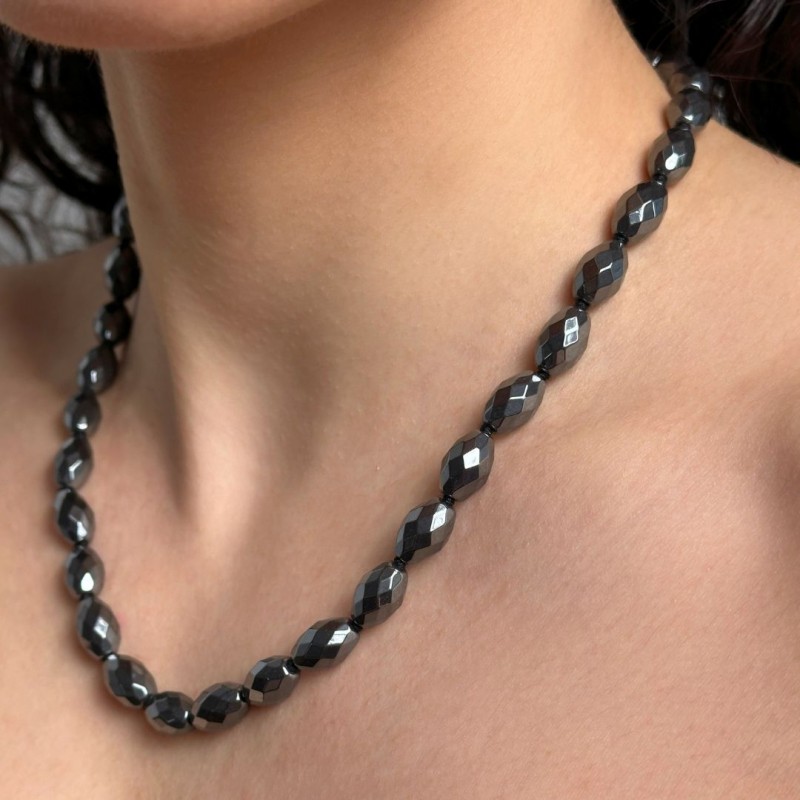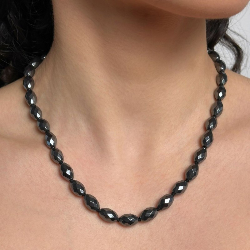 Crew neck necklace with natural hematite stones, faceted olive cut. Made with 925‰ rodent silver snap.