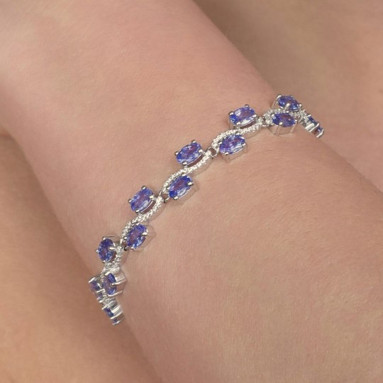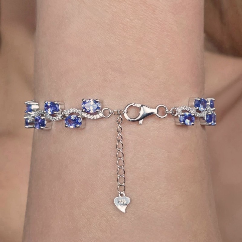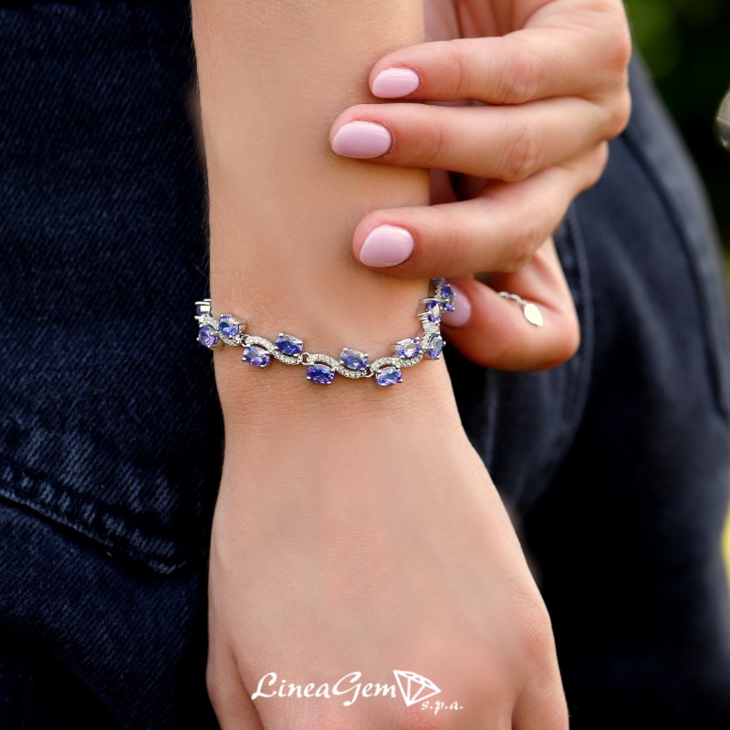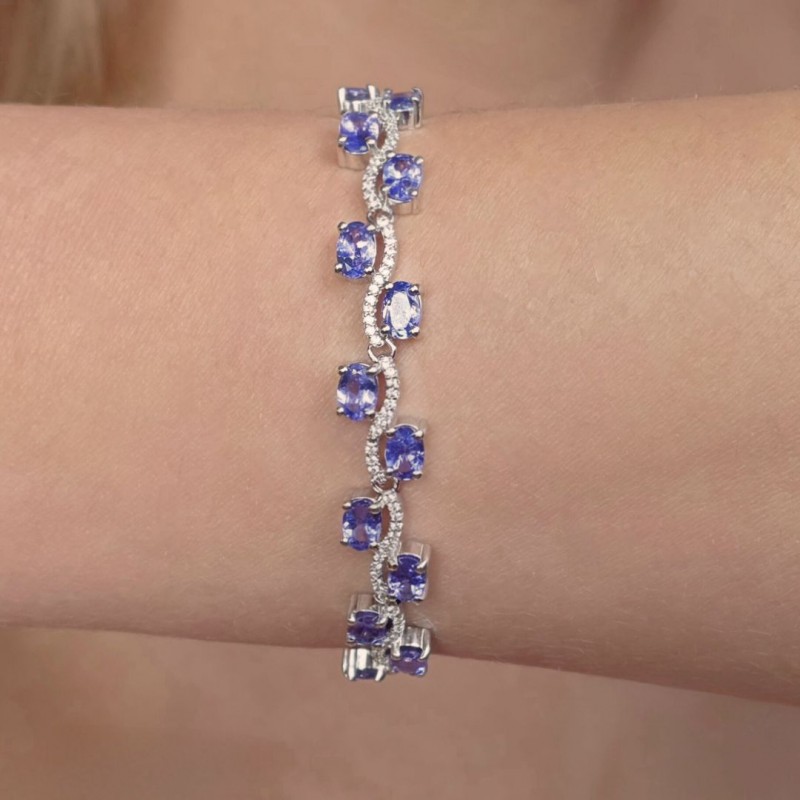 Wave bracelet with natural stones of tanzanite, cut oval faceted. Made with colourless topaz with adjustable chain and 925‰.