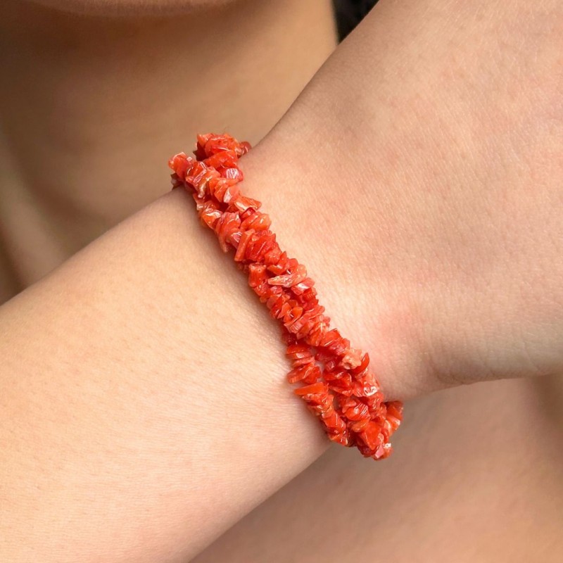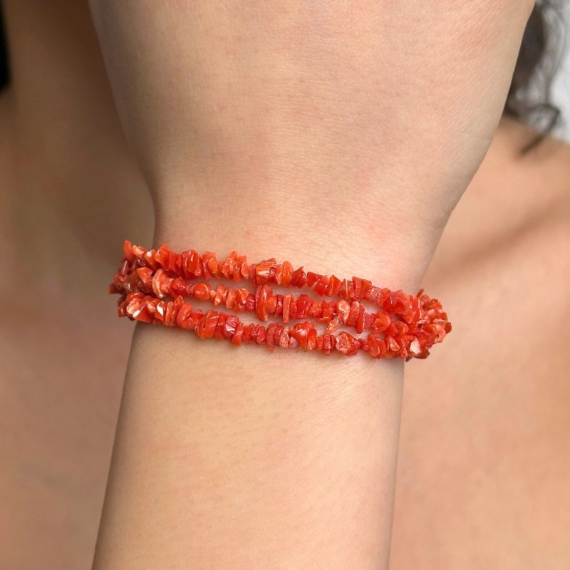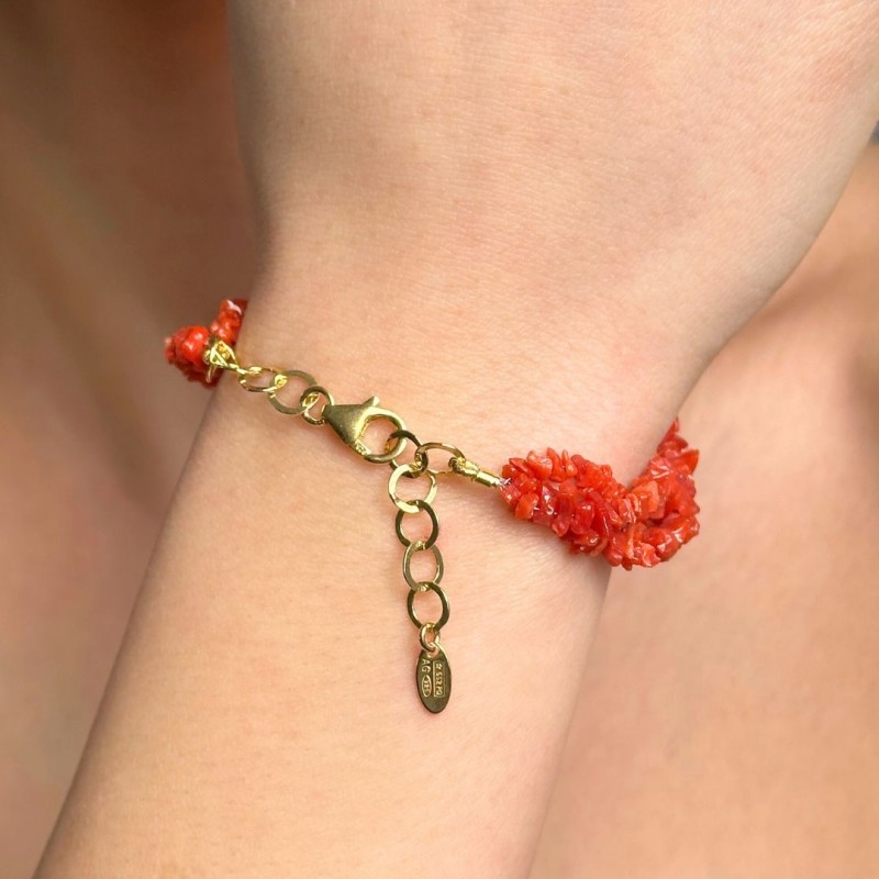 Elegance and naturalness meet in this refined bracelet composed of three threads of natural stones red coral, cut to shreds for a dynamic and vibrant effect. Its structure on a cave guarantees resistance and comfort, while the snap hook closure with flat ring chain in silver 925‰ adds a touch of class and practicality.