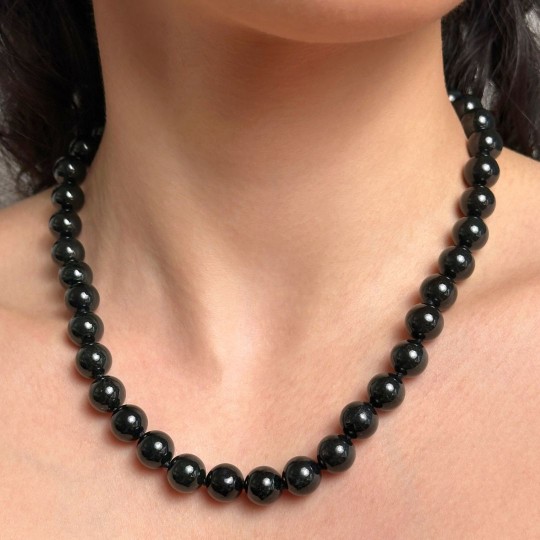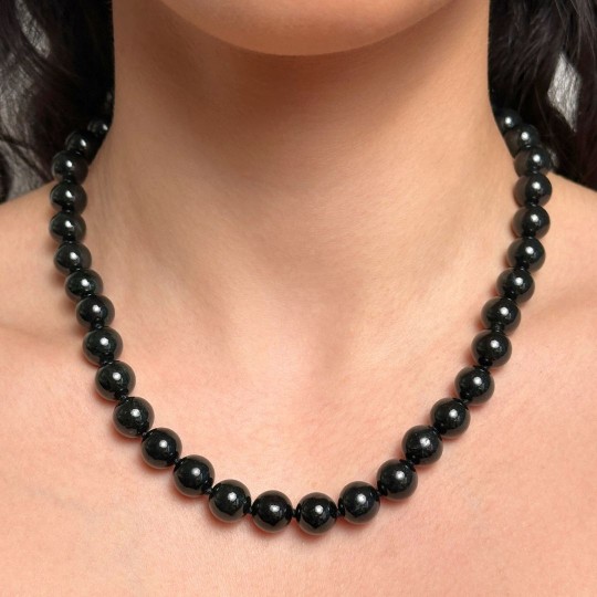 Elegant necklace with natural black jade stones, smooth spherical cut from the uniform size. Made with snap hook closure and 925‰. The length of the jewel is 45 cm. Ideal crew neck to enrich with a gritty detail every outfit.