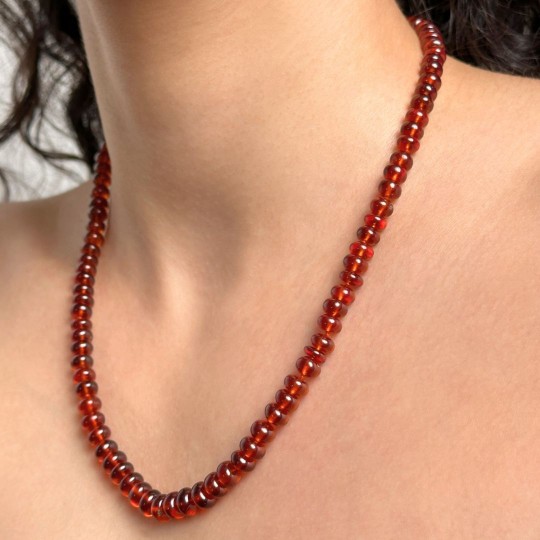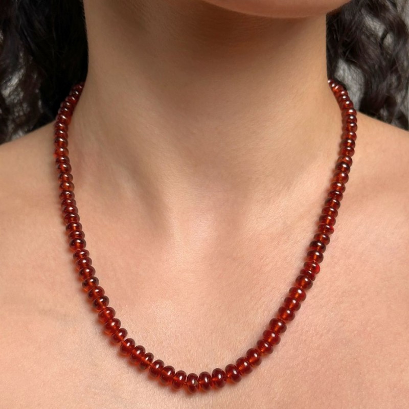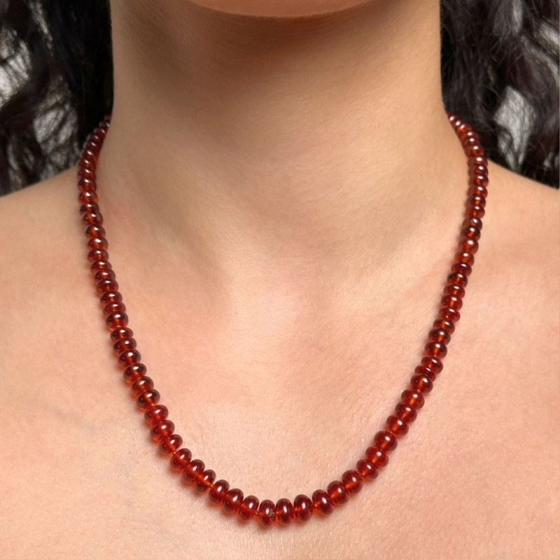 This very gritty hessonite garnet necklace with rounded shapes, falls perfectly on each decollètè. Its not too much measure, from the possibility to anyone to wear it with extreme ease.