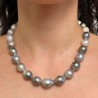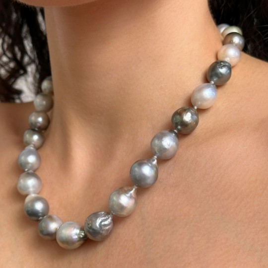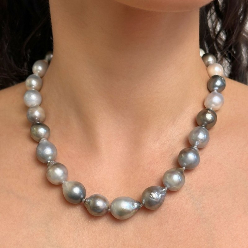 Crew neck necklace with multi-smoking Tahiti pearls with baroque shape arranged to scale with dimensions between 11.5 and 13 mm. Made with 925‰ polished silver ball clasp. Its standard length of 45 centimeters makes it fit on any of the branches.