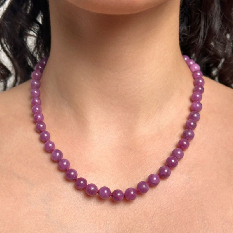 A touch of intense purple red to embrace the neck. The ruby balls, perfectly polished with 8–8,5 mm caliber, give off an intense shade that captures attention. The detail of the polished ball in silver 925‰, further enriches the jewel, while the 45 cm long make it suitable for any type of neckline. The ruby in this necklace is always the protagonist, both when you wear it individually but even if it is combined with other jewels. Follow the massive ruby call and do it yourself.