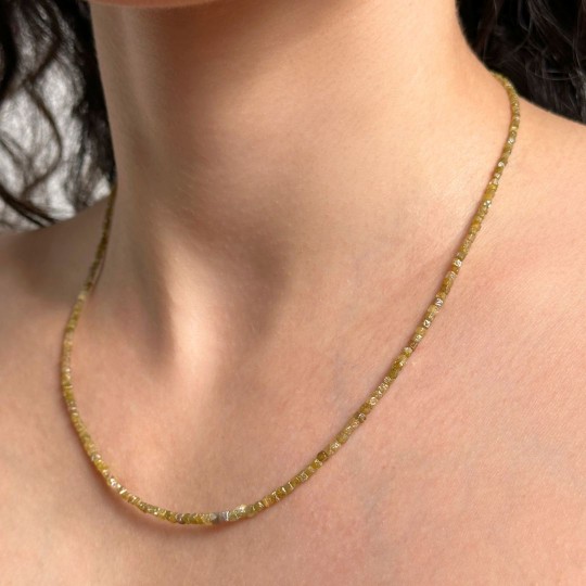 Crew neck necklace threaded on cave with natural stones of yellow/green diamond, cube cut to scale. Made with 925‰ gold silver snap.