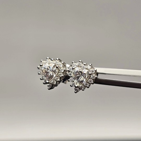 Lobe earrings with synthetic moissanite stones, heart cut and round faceted. Round silver 925‰.