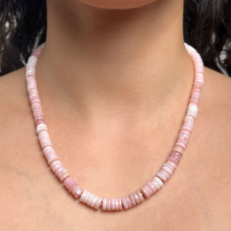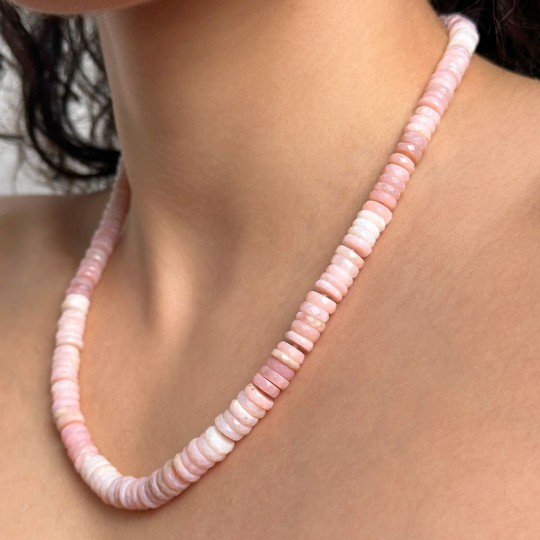 Crew neck necklace with natural stones of pink opal in color bands, cut to uncoated herd. Made with 925‰ gold silver snap.
