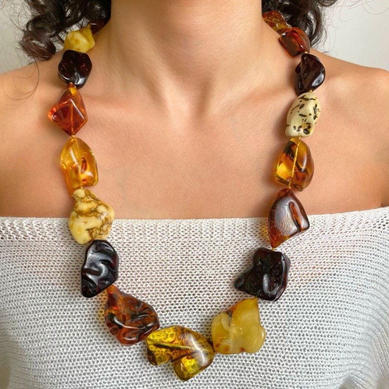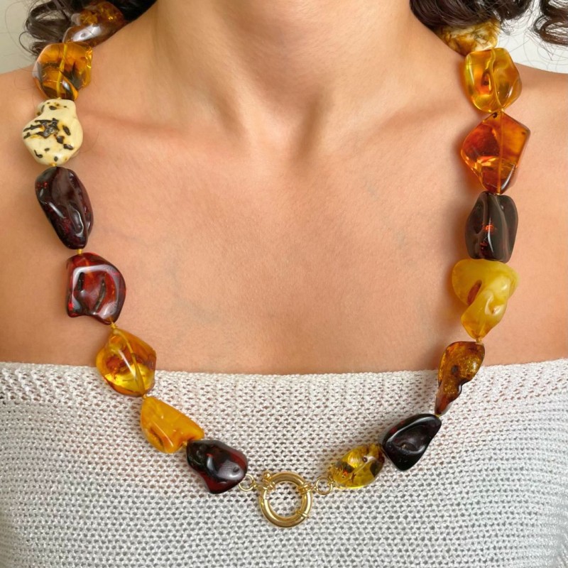 Amber Necklace of the Baltic color honey multi-smoking and real to irregular stones to scale. Made with 925‰ silver ring closure.