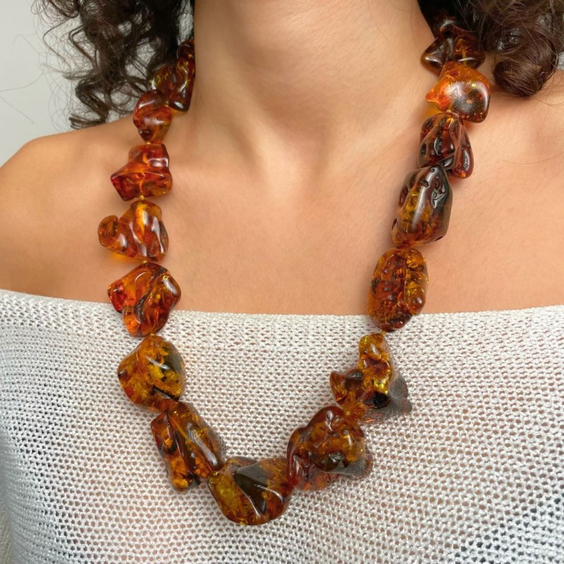 Long Necklace of Baltic Amber color honey multi-smooth with inclusions, irregular rock cutting to scale. Made with 925‰ gold silver spring ring closure.