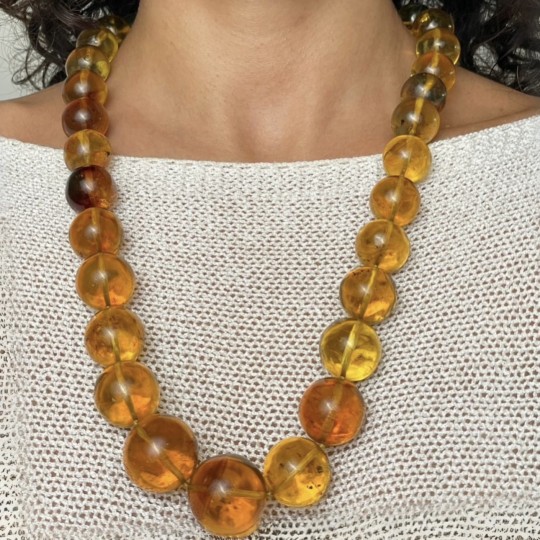 This necklace is characterized by amber stones that vary in size from 16,5 mm to 23,5 mm, creating an elegant scaling effect that adds depth and visual interest to the design. With a length of 65 cm, the necklace is perfectly positioned for a sophisticated look, suitable for both formal occasions and to add a touch of elegance to a daily clothing.