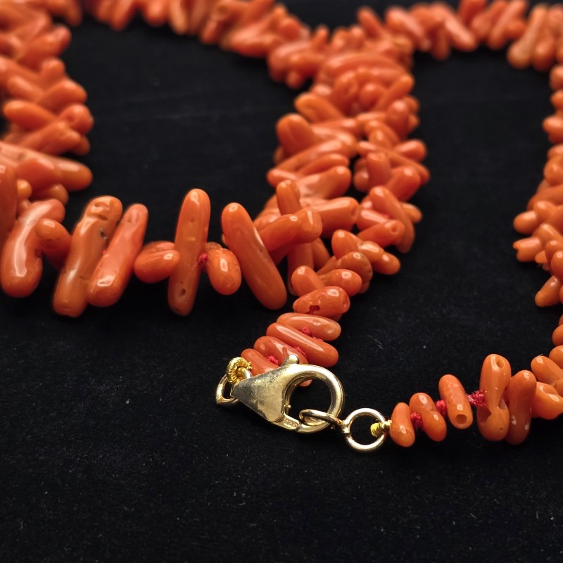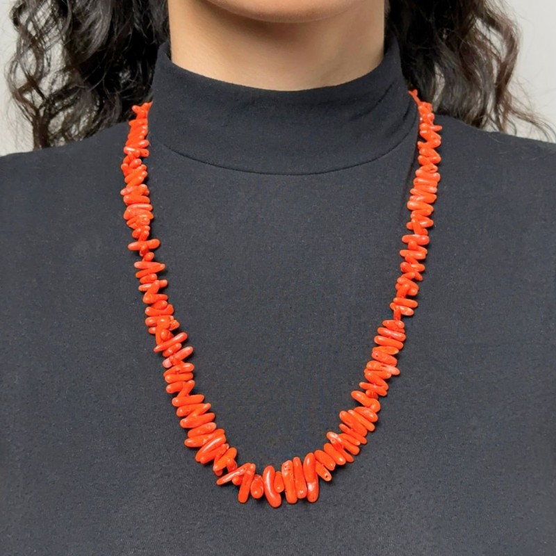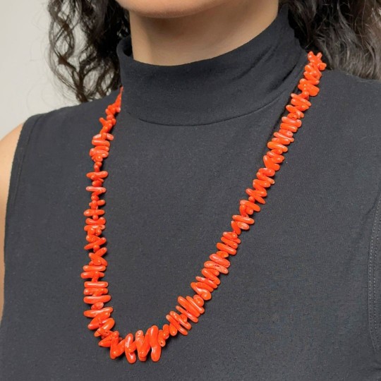 Add a touch of elegance and vivacity to your look with this beautiful red coral necklace. Made with high quality red coral, the necklace features rounded scaled trunks that vary in size from 8 to 18 mm. Each stone is finely worked and perforated in the centre, creating a harmonious and balanced design.
