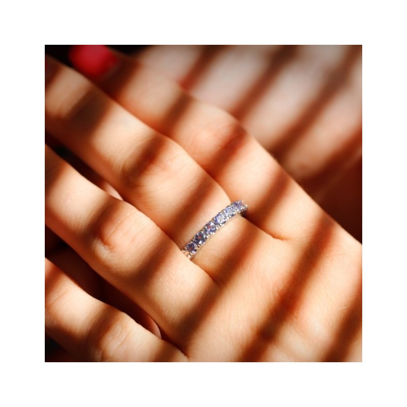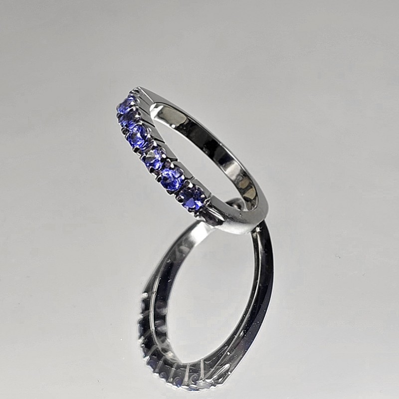 Rivière ring with 7 natural tanzanite stones, round cut faceted. 18kt white gold frame.