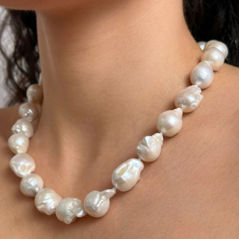 Crew neck necklace with natural pearls of white sweet water, baroque shape with nucleus to scale slightly flamed. Made with 925‰ sterling silver ring clasp.