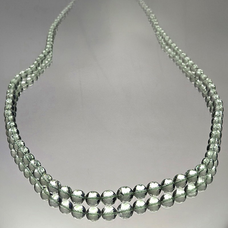 Thread with natural stones of prasiolite, faceted spherical cut to scale.