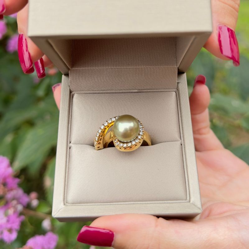 Eleganza senza tempo e fascino esotico si incontrano in questo raffinato anello in oro giallo 750‰, impreziosito da una splendida perla di Tahiti semiround da 11 mm.