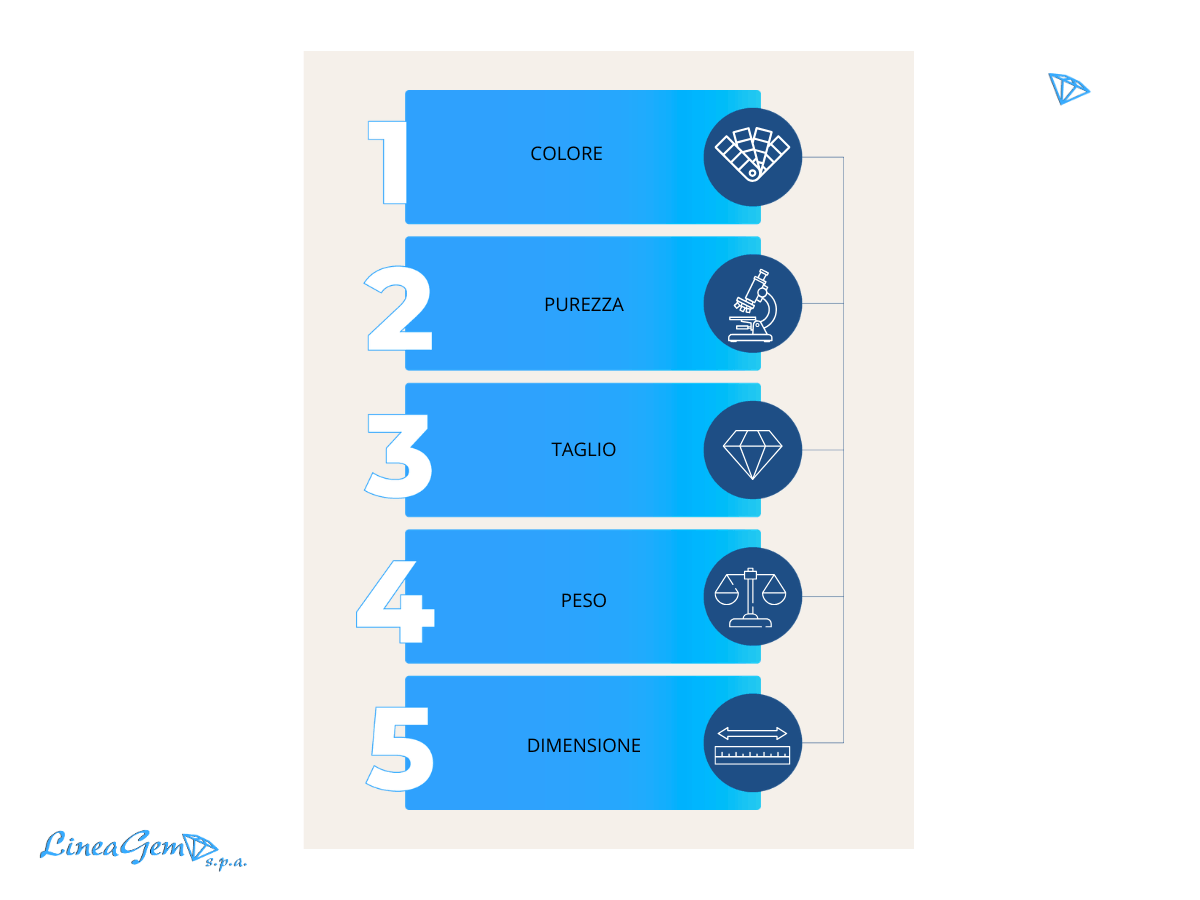 Per alcune gemme si aggiungono fattori come fenomeni ottici, provenienza o assenza di trattamenti.