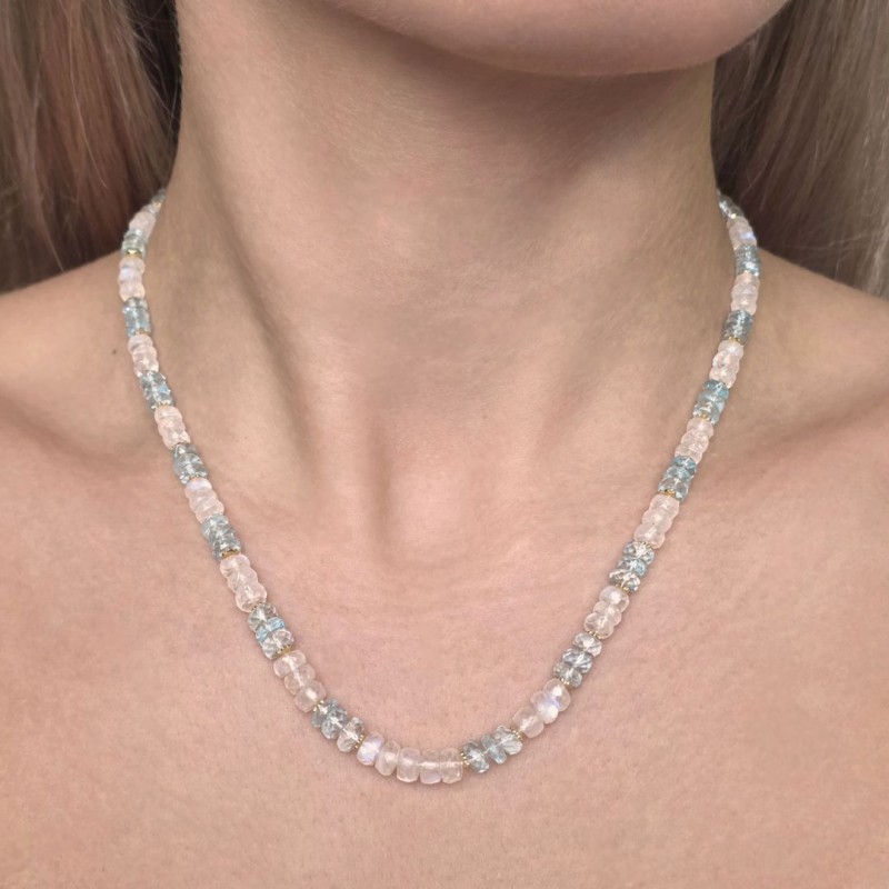 L’acquamarina, con le sue tonalità fresche e trasparenti, si alterna alla labradorite, che introduce nuance più profonde e sofisticate, dando vita a un contrasto equilibrato e mai eccessivo. La sfaccettatura delle rondelle amplifica la brillantezza complessiva, rendendo la collana luminosa e versatile.
